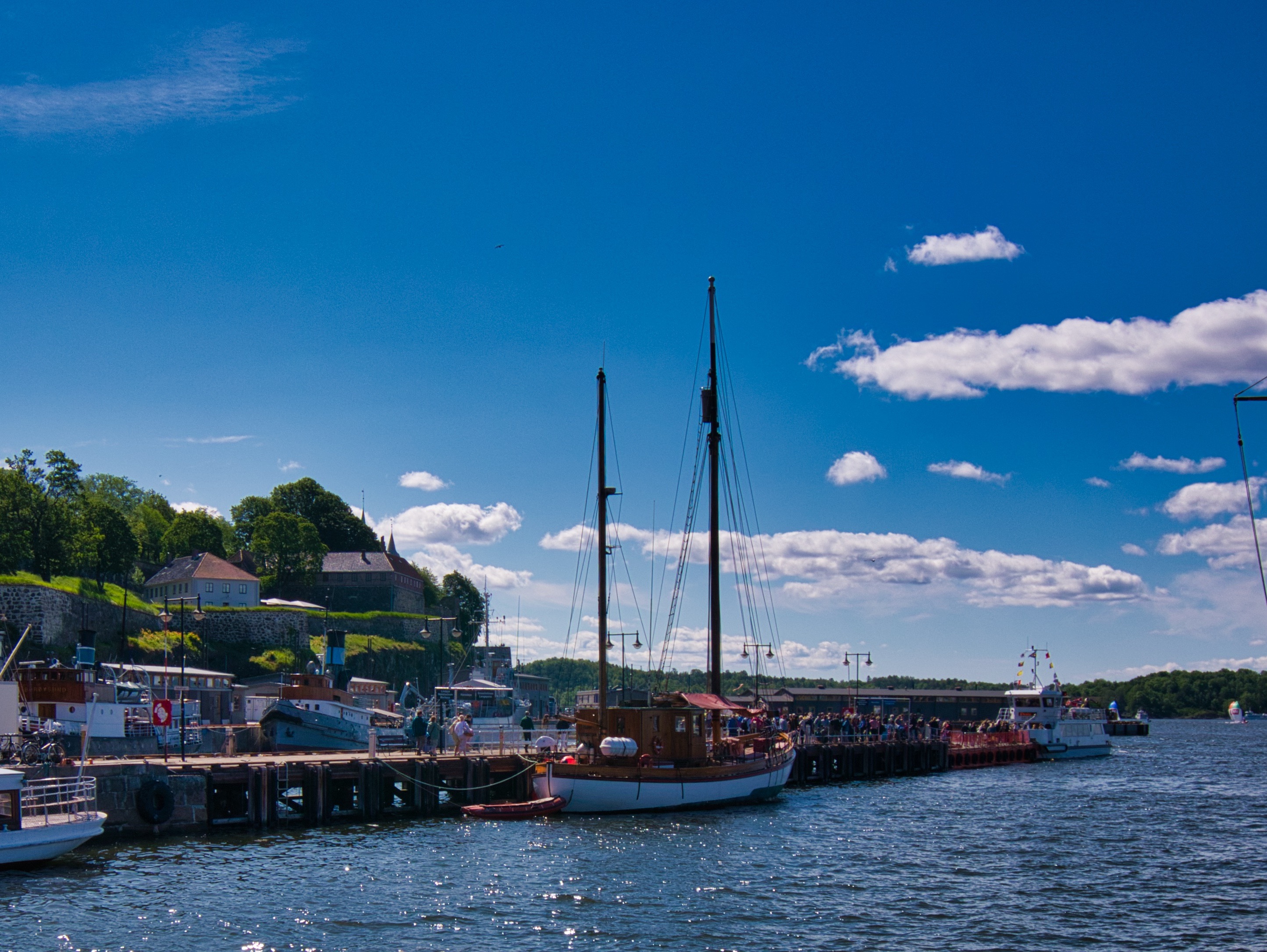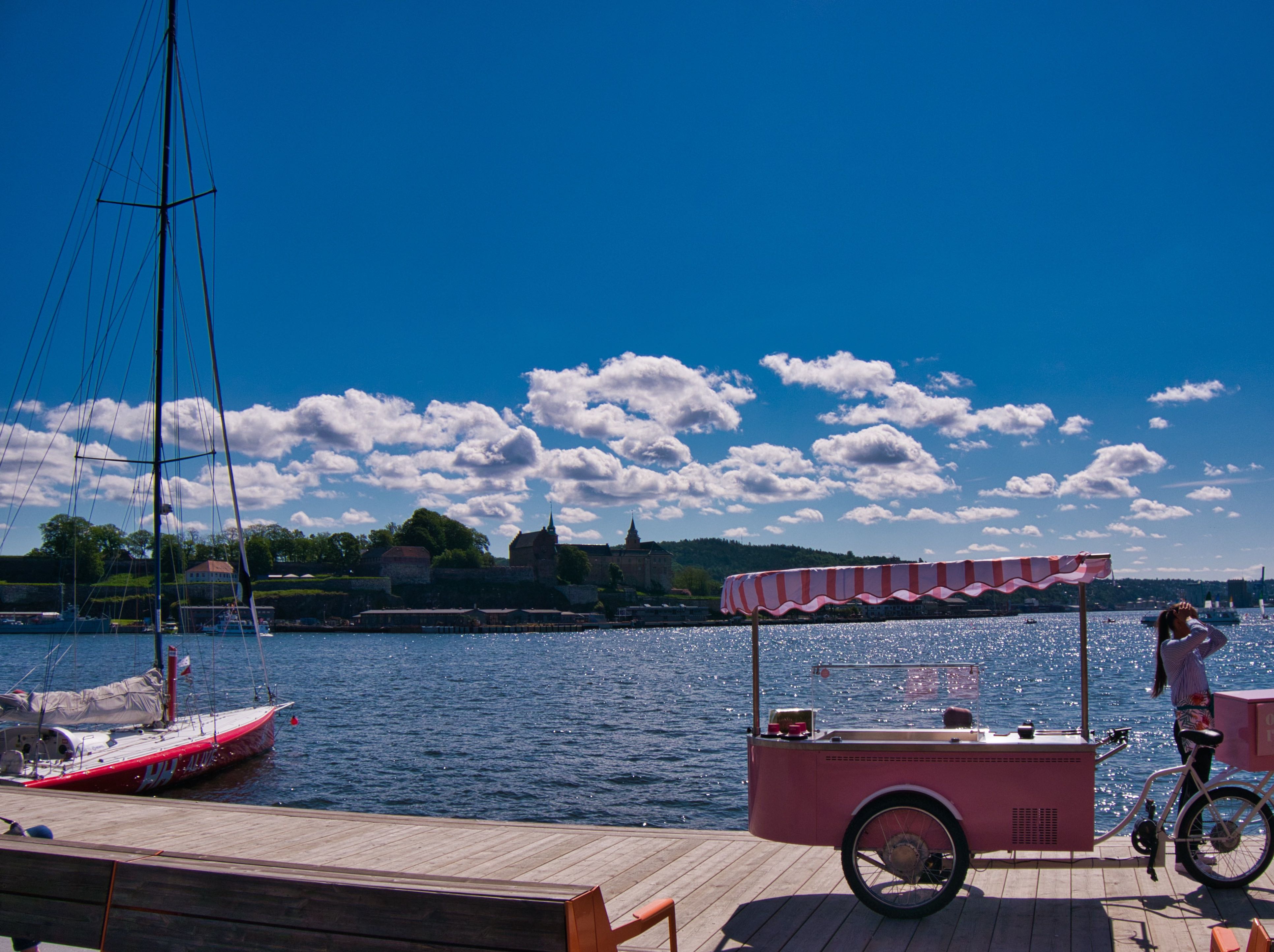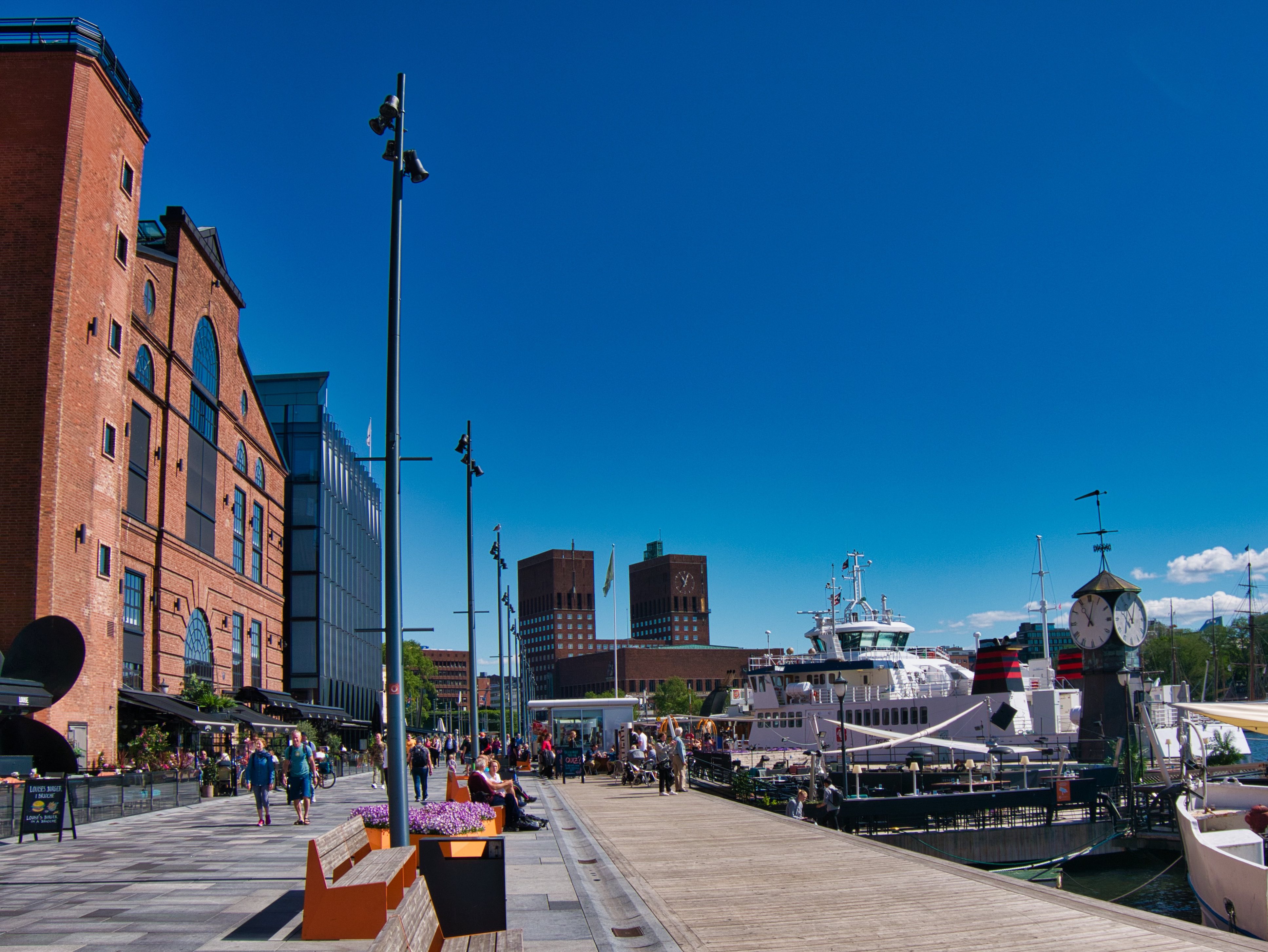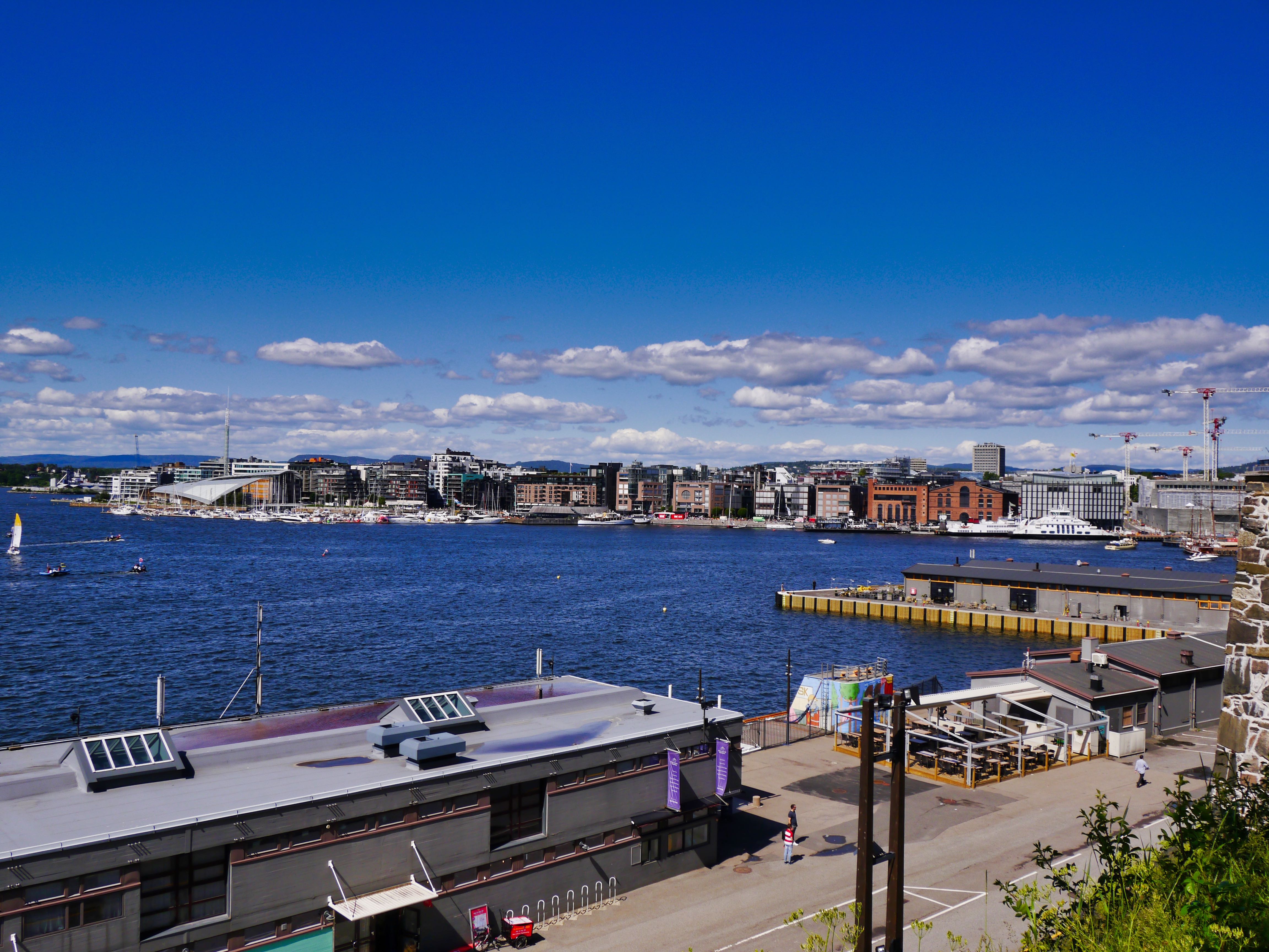 Das Gerüst für den Öffentlichen Verkehr in Oslo stellt das Nahverkehrsunternehmen Ruter mit Bussen, Trams und einem U-Bahnnetz. Ergänzt durch einen aktuell laufenden Feldversuch mit autonom verkehrenden Bussen, in denen jeweils 11 Fahrgäste Platz haben und die mit zwei Fahrzeugen – liebevoll Oda und Mats getauft – auf der Linie 35 im Rathausviertel verkehren. Leider nicht am 9. Juni, da haben sie technische Probleme und die Linie ist vorübergehend eingestellt. Ich bin zum ersten Mal enttäuscht aber nur leicht, wollte ich doch zu gerne mit einem der beiden ein paar Meter durch Oslo fahren. Na ja, nicht so schlimm. Wir erkunden auf unseren Fahrrädern Aker Brygge mit seinen unzähligen Waterfront-Restaurants, von denen eines einladender als das nächste ausschaut, fahren weiter zum Osloer Rathaus und von dort zur Festung Akershus, von der man einen fantastischen Blick auf das gegenüberliegende Aker Brygge, Bygdøy und hinauf zum Holmenkollen hat. Von wo weithin sichtbar die große Sprungschanze von der Wintersportbegeisterung der Norweger kündet.