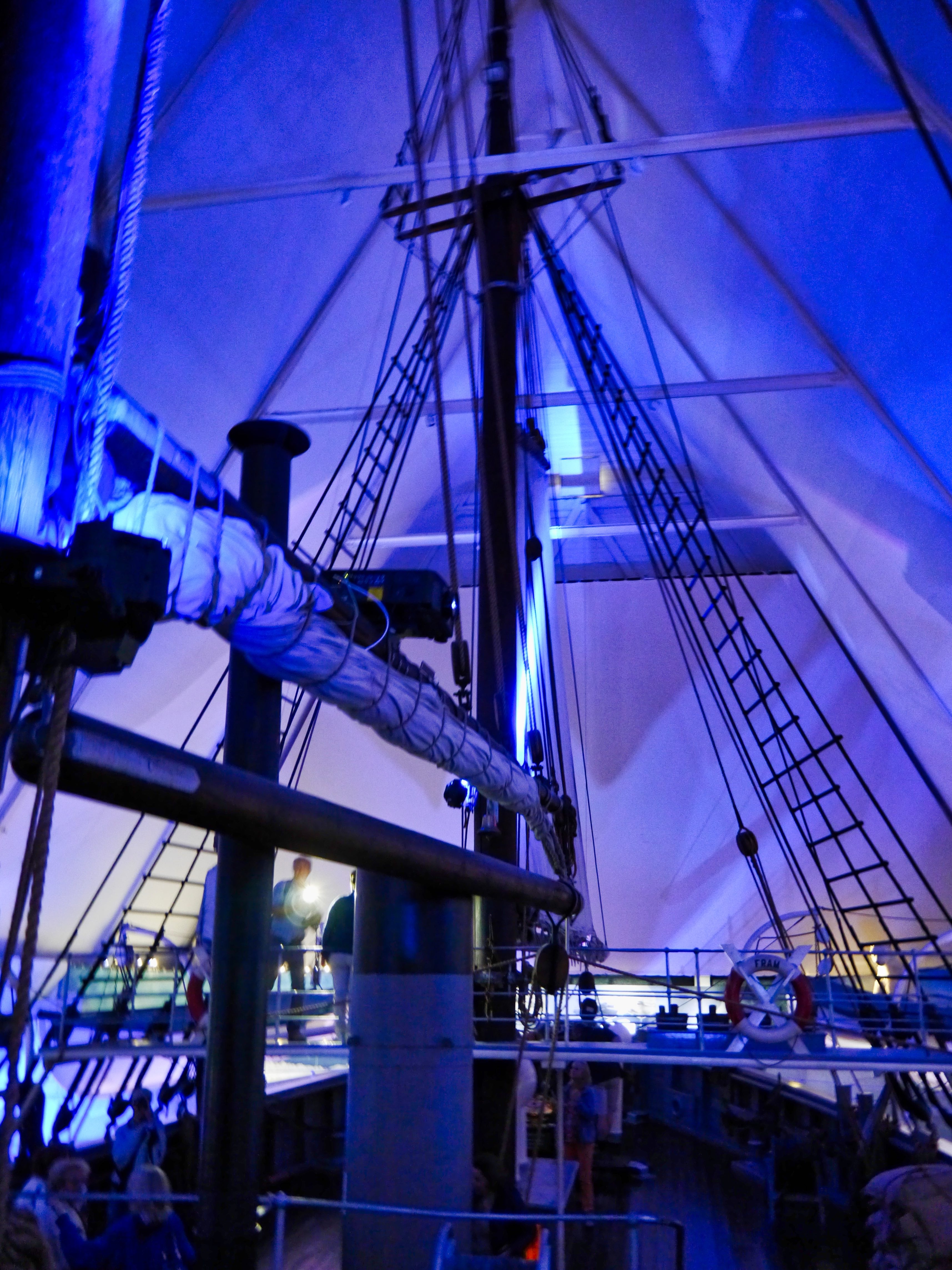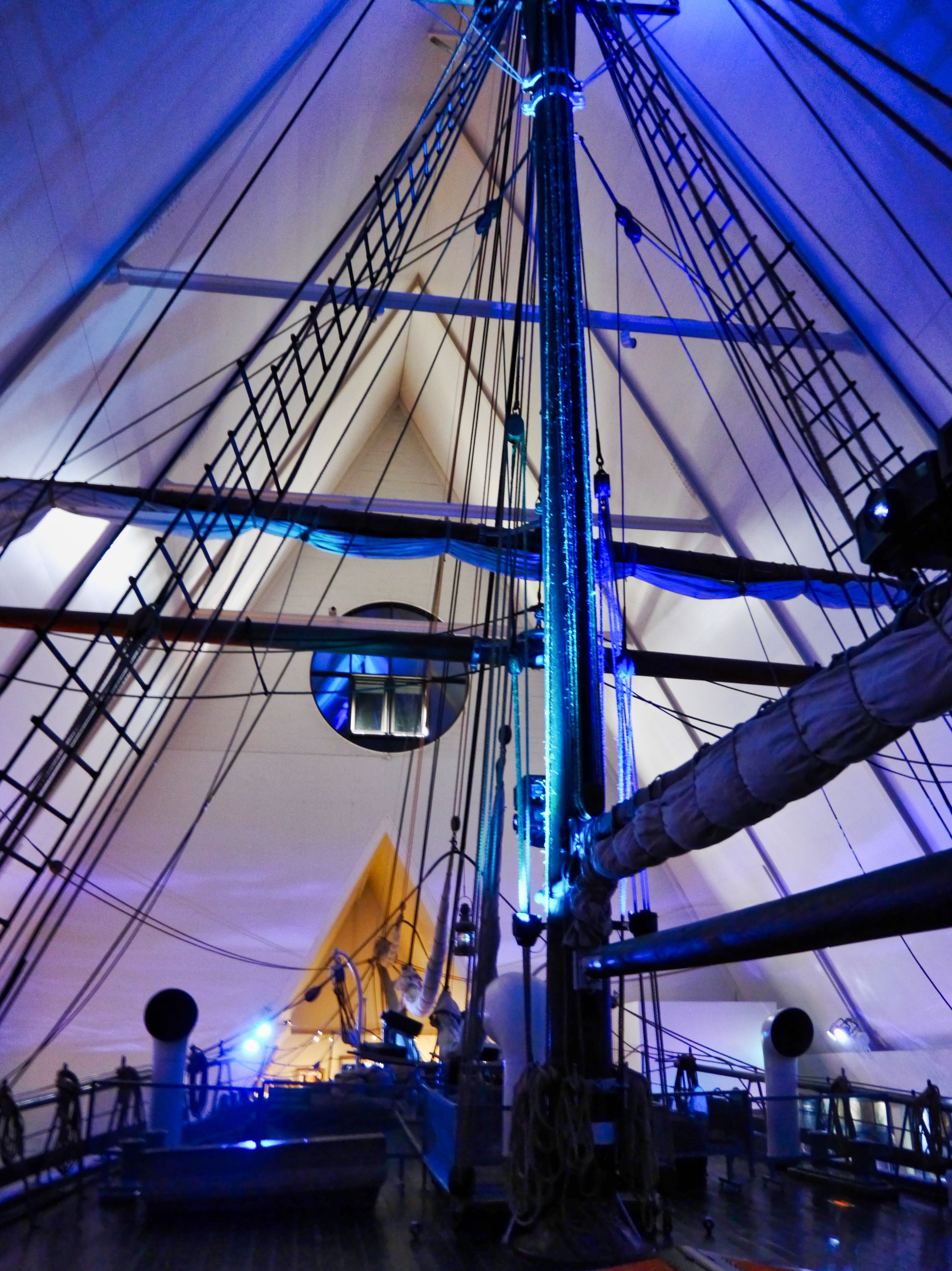 Es gibt dort neben dem Fram-Museum, das heute unser Ziel ist noch das Wikingerschiffmuseum, das Maritim-Museum und das Kon Tiki Museum, das den Expeditionen des Norwegischen Entdeckers Thor Heyerdahl gewidmet ist. Weil wir die Ra und das Kon Tiki Floß in unserer Jugend schon einmal im Rahmen einer Ausstellung im Hildesheimer Roemer und Pelizaeus Museum gesehen haben, konzentrieren wir uns heute auf andere Norwegische Entdecker: die Norwegischen Polarforscher Roald Amundsen und Fritjof Nansen. Beide nutzten für ihre Expeditionen die Fram, um die herum heute das Museum gebaut ist. Die Fram ist das einzige Schiff, das sowohl für Expeditionen zum Nordpol als auch für die Entdeckung des Südpols eingesetzt wurde. Die Ausstellung ist sehr lebendig, abwechslungsreich und unterhaltsam. Sie spricht nahezu alle Sinne an – auch weil man tatsächlich auf der Fram bis hinunter in die Mannschaftsunterkünfte und den Maschinenraum herumläuft, selbst ausprobieren kann wie schwer die Schlitten mit Proviant uns Ausrüstung zu ziehen waren und eindrucksvoll die gnadenlose ständige Kälte am eigenen Körper erleben darf, in der die Männer unterwegs waren. Absolut empfehlenswert!