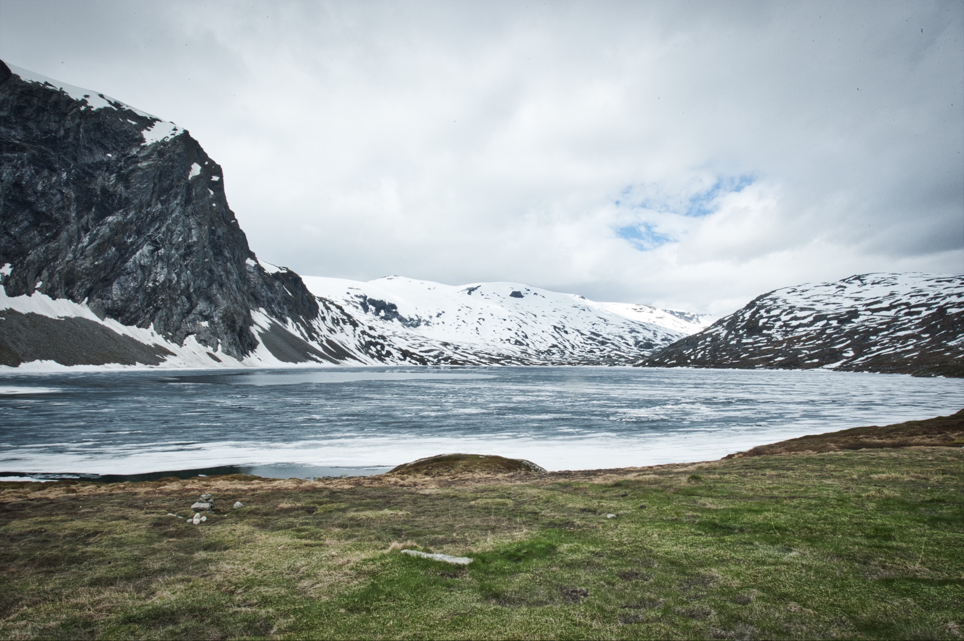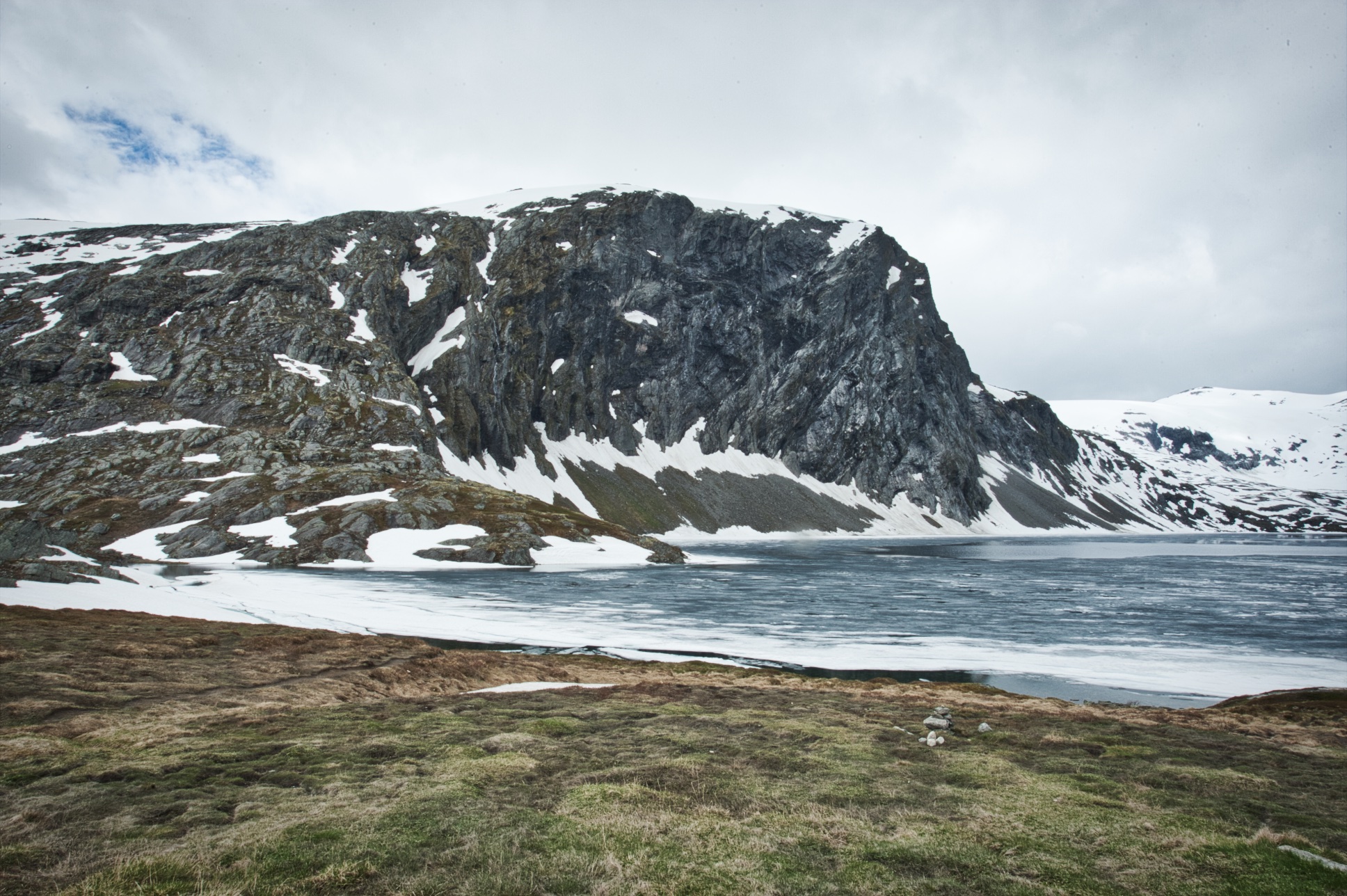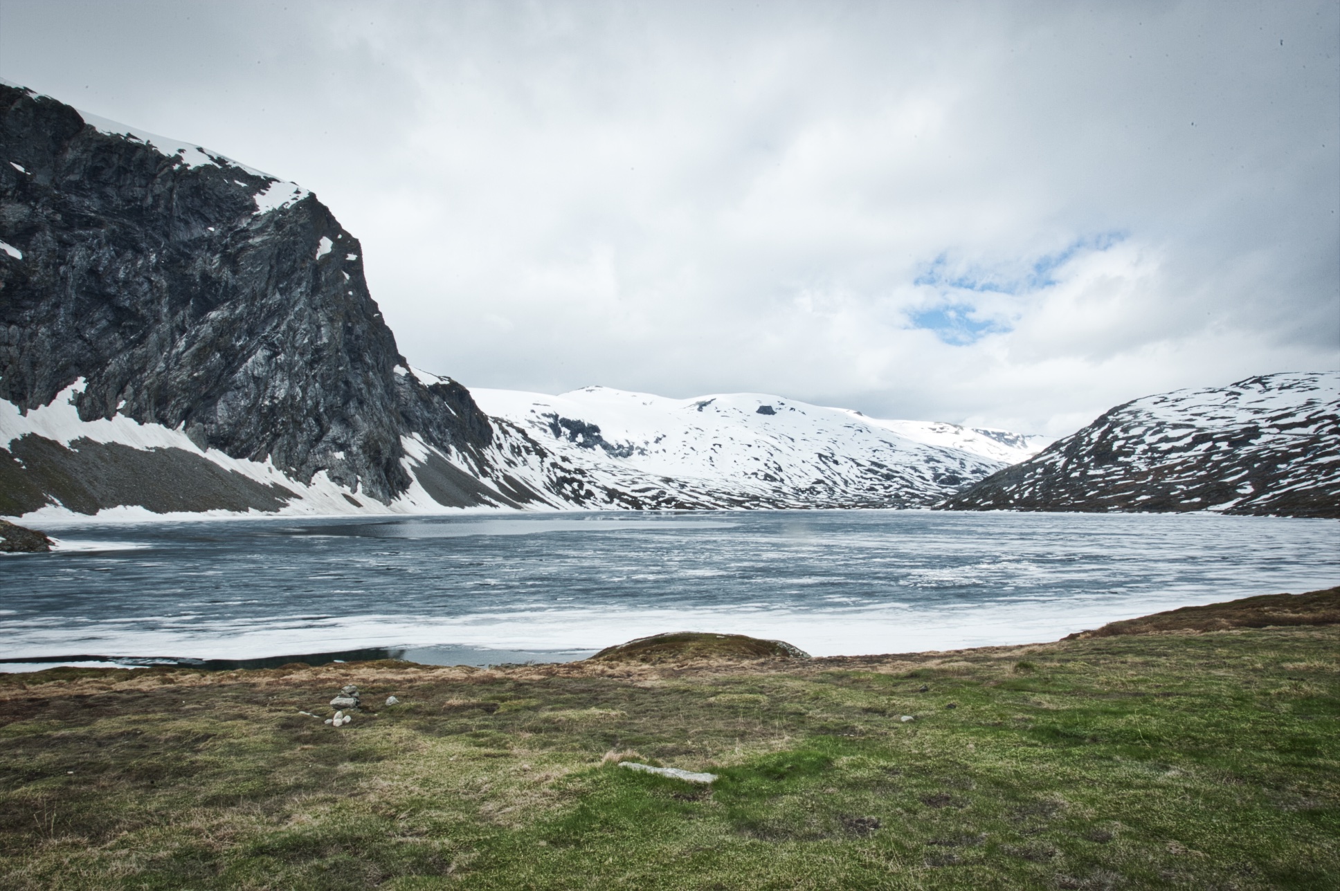 Gesagt getan, die Fahrt über die Rv 63, die Geirangerstraße, auf den Dalsnibba ist verbunden mit einer ziemlichen Kurbelei, die Reisebusse und gemieteten Elektromobile zweier Kreuzfahrtschiffe plus die große Zahl abreisender Wohnmobile reichen auch schon, um die Aussichtspunkte und die Straße ziemlich zu verstopfen. So kommen wir erst am Djupvatnet zu einem Halt. Ende Juni noch nahezu komplett zugefroren liegt er da. 2 qkm groß auf etwas mehr als 1000m Höhe. Wir gönnen uns und den Hunden eine Rast und Bewegung im Schnee und sind wieder einmal beeindruckt, wie schnell Landschaften und Wetter einander abwechseln.