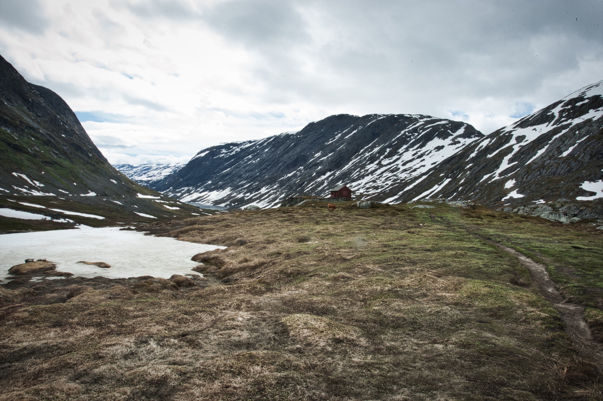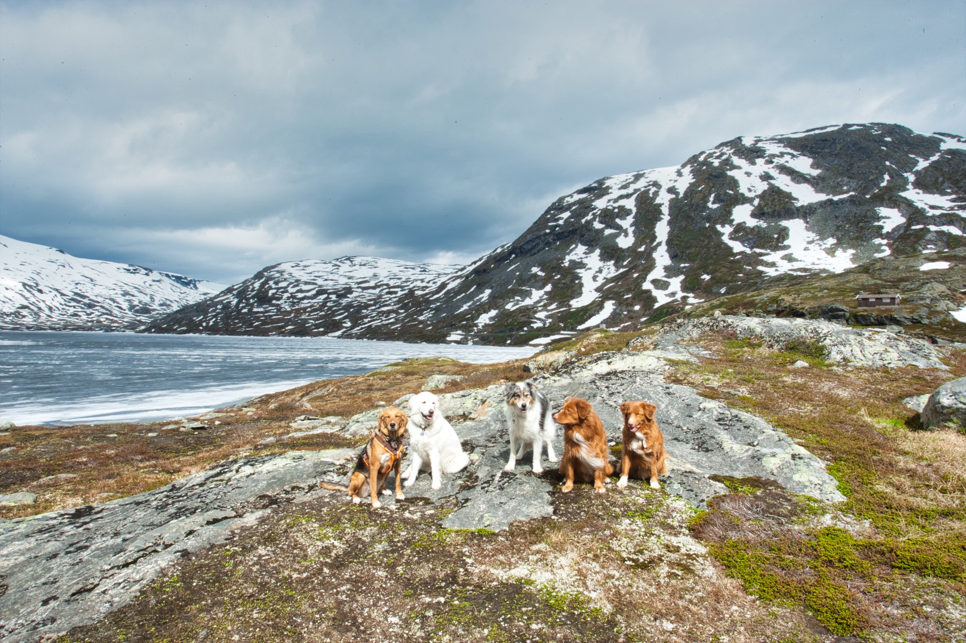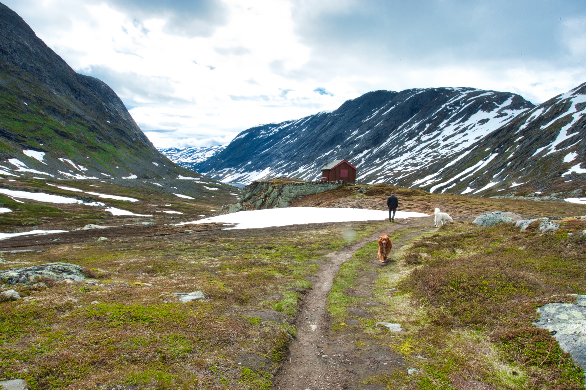 Gesagt getan, die Fahrt über die Rv 63, die Geirangerstraße, auf den Dalsnibba ist verbunden mit einer ziemlichen Kurbelei, die Reisebusse und gemieteten Elektromobile zweier Kreuzfahrtschiffe plus die große Zahl abreisender Wohnmobile reichen auch schon, um die Aussichtspunkte und die Straße ziemlich zu verstopfen. So kommen wir erst am Djupvatnet zu einem Halt. Ende Juni noch nahezu komplett zugefroren liegt er da. 2 qkm groß auf etwas mehr als 1000m Höhe. Wir gönnen uns und den Hunden eine Rast und Bewegung im Schnee und sind wieder einmal beeindruckt, wie schnell Landschaften und Wetter einander abwechseln.