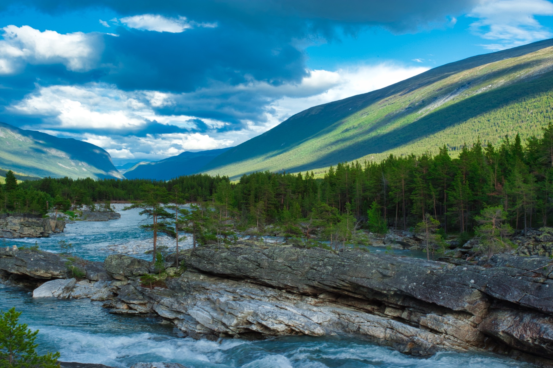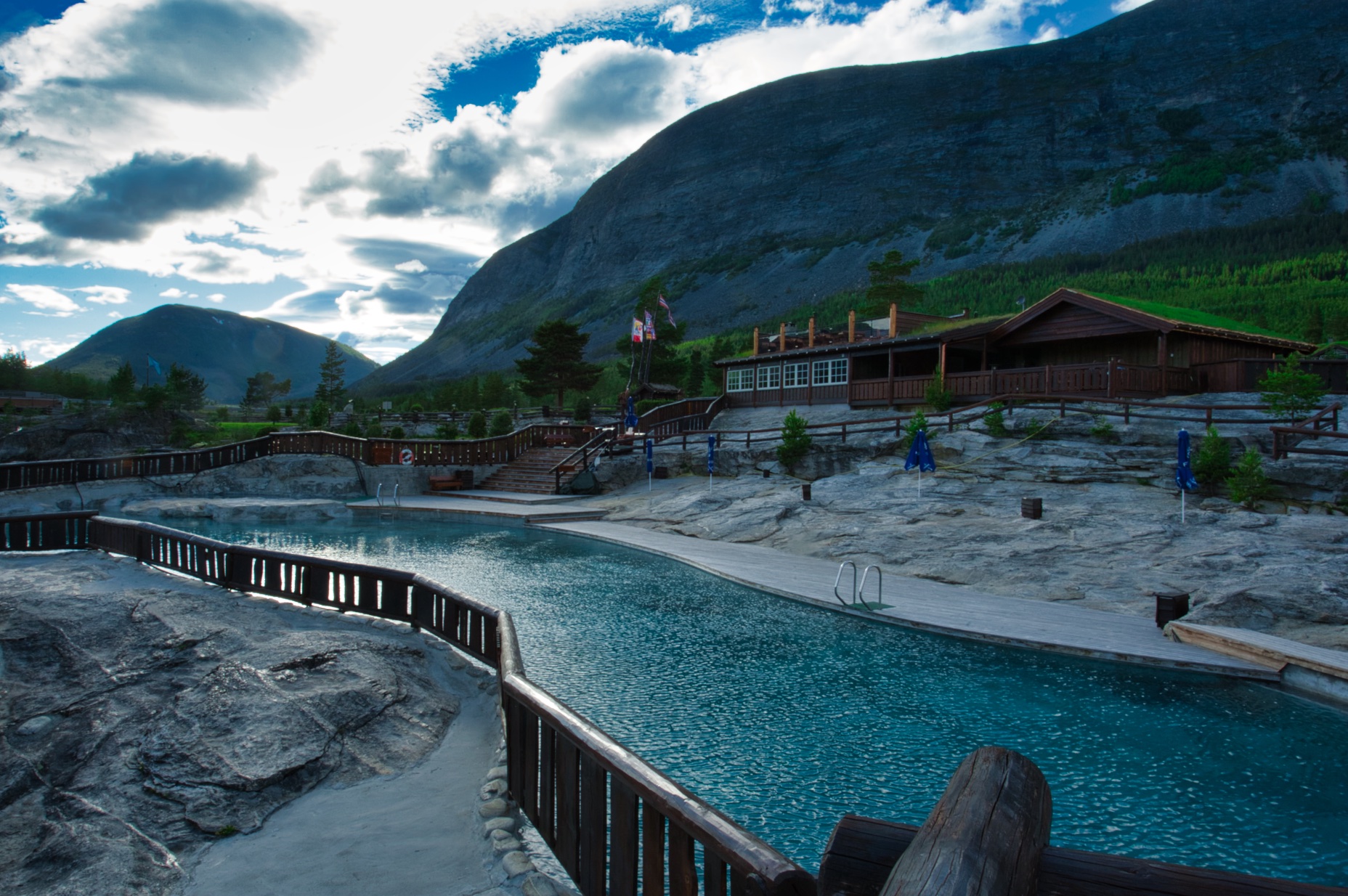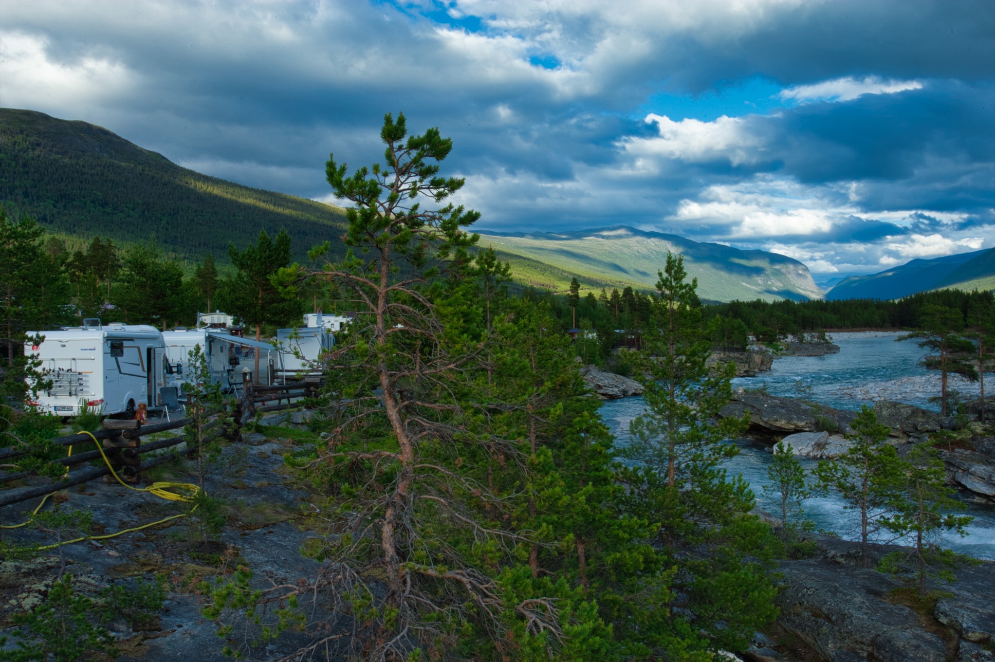 Einige Kilometer weiter mündet der Rv 63 in die E15, die wir ab sofort in Richtung Otta befahren. Um uns herum eine lichte Waldlandschaft, Seen, Flüsse, mal reißend, mal gemächlicher dahinfließend. Wieder etwas völlig Neues und wieder einmal umwerfend schön. Eher zufällig taucht links ein Campingplatz unmittelbar an dem neben der Straße tosenden Wasserfall Dønfossen auf, Dønfoss Camping. Spontan belegen wir auf dem wenig besuchten aber herrlich angelegten Areal zwei Stellplätze direkt am Fluß. Die Anlage erinnert ein bisschen an eine Westernstadt im Heidepark oder in Disneyworld. Überall stehen zudem Bänke, die natürlichen Gegebenheiten wurden in die Platzgestaltung eingearbeitet und so gibt es sogar ein Naturschwimmbecken direkt am Fluß, für dass man vorhandene Felsen genutzt hat. Die Wassertemperatur liegt zwischen 16 und 19 Grad. Der Campingplatz verfügt über ein kleines, sehr geschmackvoll eingerichtetes Restaurant, in dem man Pizza und selbstgemachte Hamburger mit einem lokalen Bier genießen kann. Die Sanitäranlagen sind wie auf allen Plätzen in Norwegen super sauber und gepflegt.