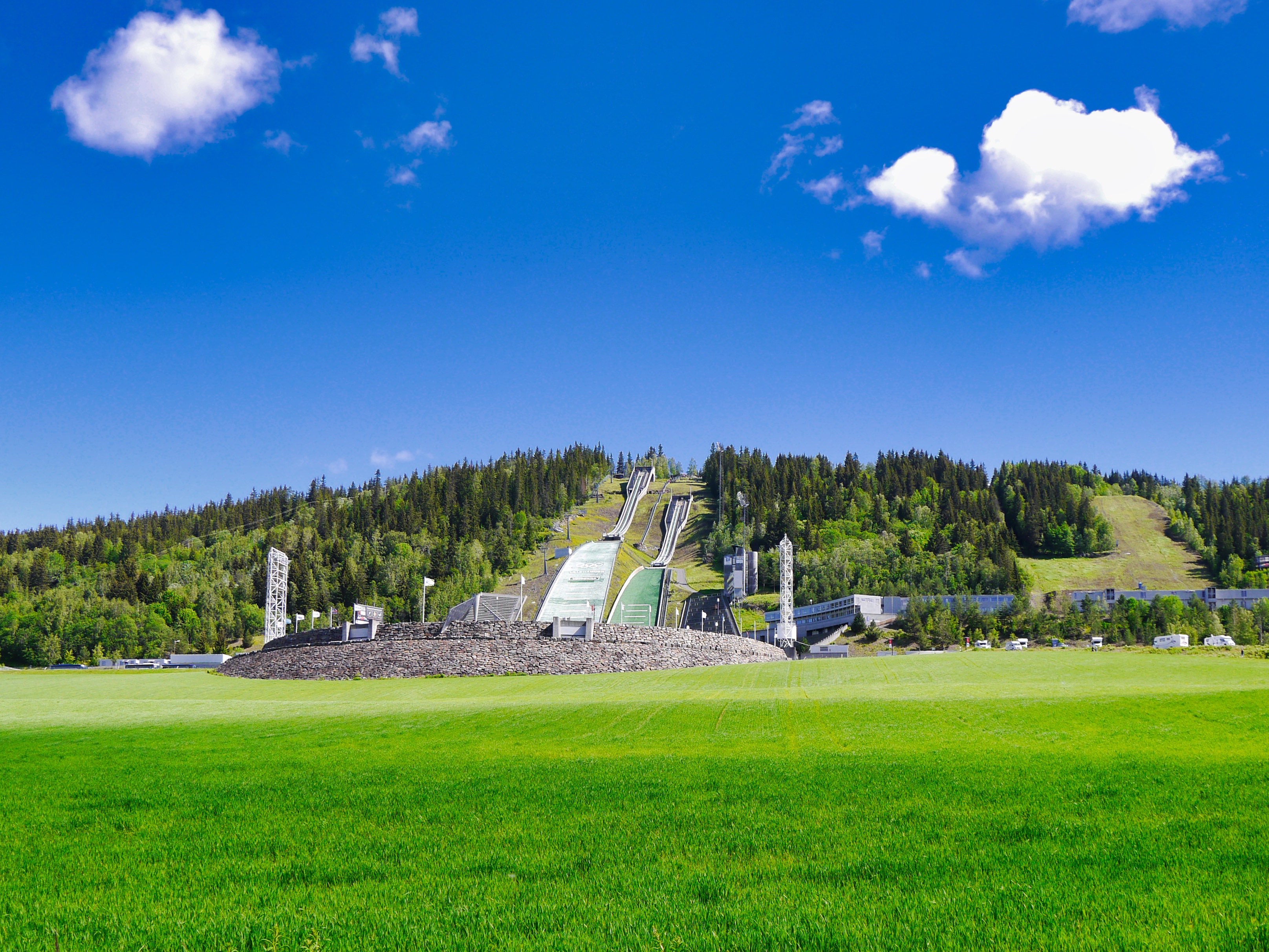 Direkt hinter dem Park geht es rechts nach Maihaugen, dem Freilichtmuseum mit mehr als 200 Bauwerken aus ganz Norwegen, u.a. dem Geburtshaus von Königin Sonia. Nach links öffnet sich die Store Gatan, die Fußgängerzone von Lillehammer mit zahlreichen bunten Holzhäusern. Sie ist eher kurz, blumengeschmückt und auch hier genießen die Menschen den Sommerabend in zahlreichen Restaurants und Eisdielen mit Freisitz. Über der Stadt, die sich einen steilen Berghang am Nordende des Mjøsa hinaufzieht, liegen die Sportstädten und das ehemalige Olmpische Dorf. Weithin sichtbar die beiden Skisprungschanzen, ähnlich wie schon am Holmenkollen in Oslo, hier allerdings wirkt alles wie bei einer Miniaturversion.