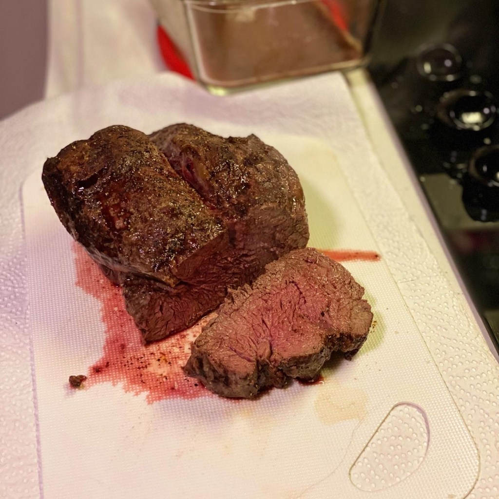 Die Küche im Integra hat einen 3-Flammen-Kocher, der soviel Platz bietet, dass auch tatsächlich 3 Töpfe oder Pfannen nebeneinander verwendet werden können. Dazu gibts mit der Serienausstattung auch noch einen Backofen. Den hatten wir bis dato nicht vermisst aber wenn er da ist, wird er auch eingespannt. Mit einem Funkthermometer lässt sich die doch sehr ungenaue Temperatursteuerung im Backofen optimal umgehen und das Rinderfilet wird auf den Punkt gegart.