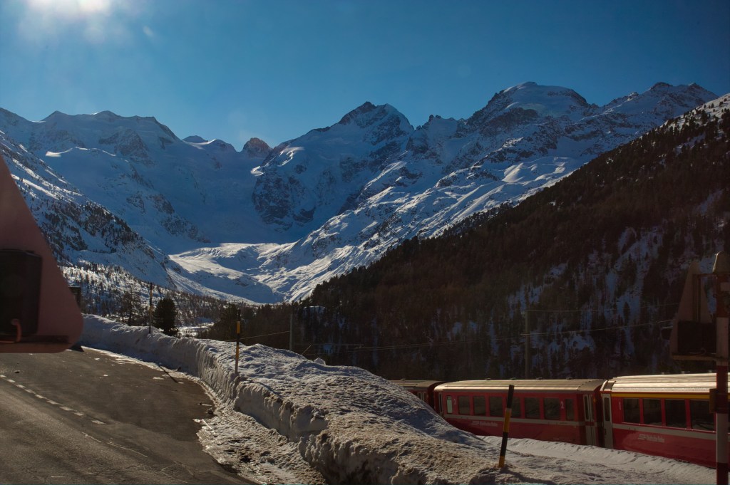 Auf der anderen Seite des Julier liegt das Engadin. Zuerst fährt man vorbei am Silvaplanasee, dann kommt das mondäne Sankt Moritz, später Pontresina und schließlich der Abzweig ins Val Morteratsch. Luft und Licht im Engadin sind einzigartig, dazu die Höhe von fast 2000 Metern und der spektakuläre Blick auf die über 4000m hohe Berninagruppe mit Piz Palü, Piz Morteratsch und Piz Bernina. Kein Ort, an dem ich an den letzten ruhigen Tagen des Jahres lieber sein würde.