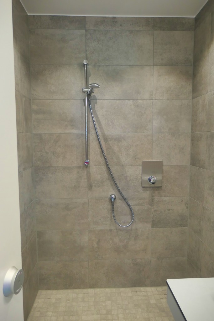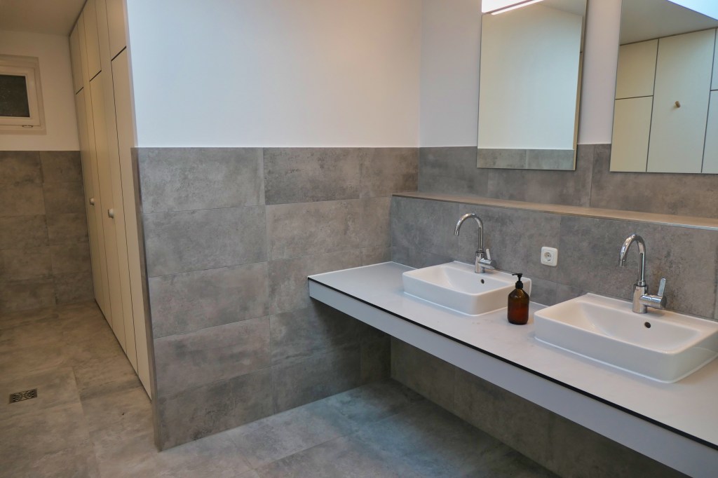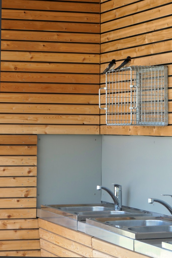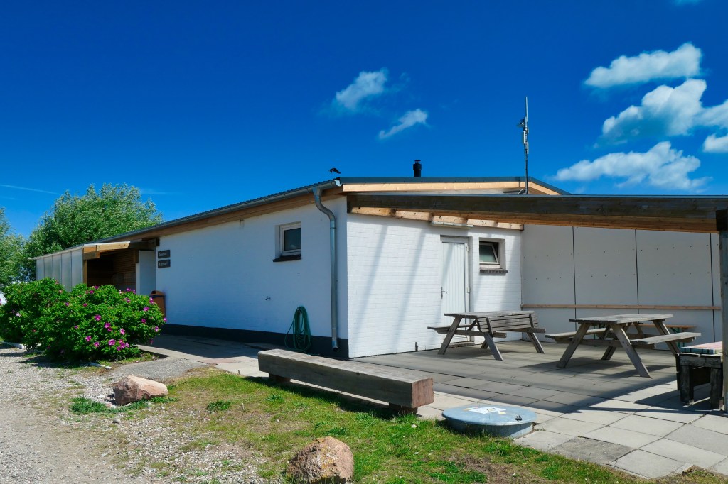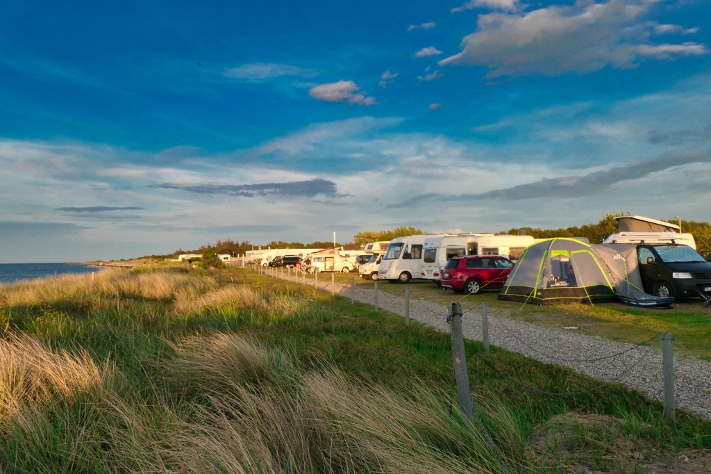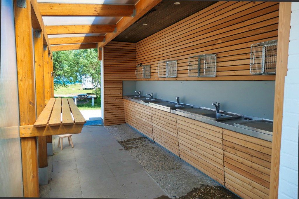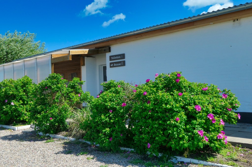 Zurück zum Platz: wir sind mit knapp 8 Metern zu lang für die Stellplätze in der ersten Reihe, waren aber mit unserer unverstellten Ostsee-Aussicht durch die Frontscheibe auch in der zweiten Reihe bestens bedient. Strom und Wasser gibt’s auf jedem Platz. Außerdem drei Sanitärhäuschen, entweder nagelneu oder neu renoviert, piccobello sauber mit riesigen Duschen und wirklich ausreichend Ablageflächen. Münzen oder sonstwie zeitgesteuerter Zufluss warmen Wassers gibt es nicht. Wer warmes Wasser will, dreht den Hahn auf, fertig. So entspannt, wie das Konzept und die Menschen, die sich kümmern.