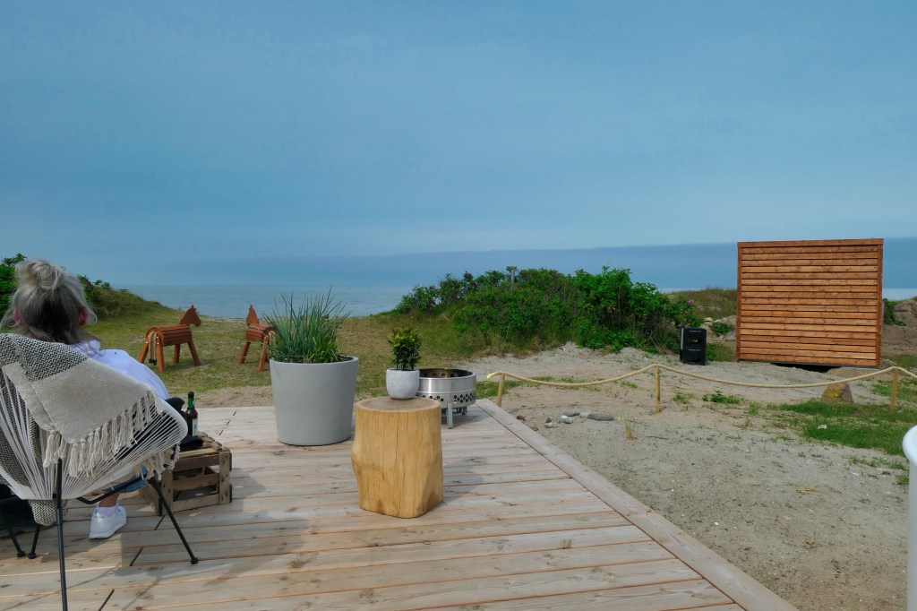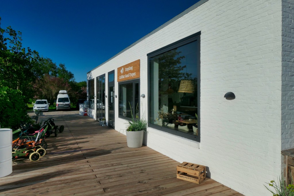 Direkt an der Einfahrt auf den Platz das große Empfangsgebäude, wo besagte Kettcar verliehen werden, ein Saltwater Shop und das Cafe Sand Tropez, das neben allerlei Kaffeespezialitäten, Longdrinks und anderen Getränken auch selbstgebackene Kuchen im Programm hat, der – mindestens der Rhabarberkuchen, soviel kann ich aus eigener Erfahrung sagen, sensationell schmeckt. Die Terrasse mit Blick auf die Ostsee ist einfach nur schön, so liebevoll eingerichtet und gestaltet wie alles auf dem Platz. Musikalische Untermalung a la Cafe del Mar katapultierte uns noch am ersten Nachmittag mitten hinein in die Urlaubserholung.