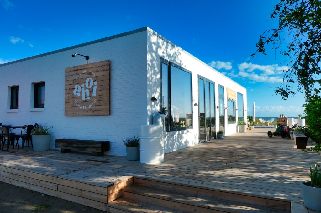 AHOI Camp Fehmarn liegt auf dem Gelände des früheren Camping Fehmarnbelt in Altenteil, der nordwestlichsten Ecke von Fehmarn. Seit Jahrzehnten einer der Surfspots auf Fehmarn. Das war es dann aber auch schon mit Gemeinsamkeiten. Entstanden ist hier etwas ganz Wunderbares, eine Art Freiluft Chillout Oase für Wassersportler, deren Freunde und vor allem Familien. Den ganzen Tag pulsiert das Leben auf dem Platz, brettern Kinder in den platzeigenen Kettcars, die kostenlos ausgeliehen werden können durch die Wege. Auf fast jedem Platz gibt’s einen Hund, dafür gibt’s keine Zäune oder Hecken, alles ist offen und sogar aus der zweiten Reihe blickt man ungehindert auf die Ostsee – und die den Belt querenden Fracht- oder Kreuzfahrtschiffe. Am Strand, an den der Platz direkt grenzt dann jede erdenkliche Art von Wassersport, für die man Bretter und/oder Segel, Schirme, Wings usw. braucht. Wer das nicht tut, der angelt, hatte ich jedenfalls das Gefühl. Mir war bis dahin nicht klar, dass Angeln unter so vielen jungen Menschen eine so große Zahl an Anhängern hat.